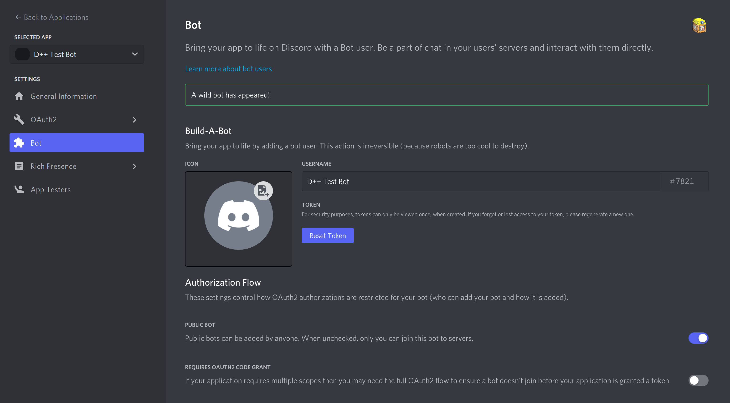 In this panel, you can get your bot token by clicking "Reset Token". A bot token looks like this: